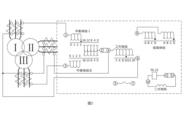 当用BCH-2型继电器来保护电力变压器时,平衡绕组的圈数根据这样的条件来选择,即当发生穿越短路时.所有绕组的匝数应相等。