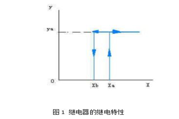 继电器输出入量和输出量之间在整个变化过程中的相互关系成为继电器的继电特征或控制特征。用x表示输入回路量,y表示输出回路的输出量,如图1所示。当输出量x 连续变化到一定量xa时,输出量y发生跃变,有0增加到ya值,则是输入量继续增加,是输出保持不变。相反,当减少到xb是,y又突然由ya减少到0.xa被称为继电器的动作值,xb被称为继电器的释放值,ya即是继电器的负载。