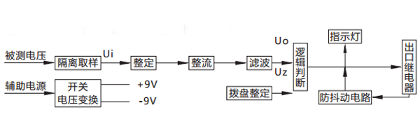 被测电压经过电阻分压取样,得到与被测电压成比例的取样电压Ui , Ui经拨盘整定,再进行整流滤波,得到直流Uo ,逻辑回将Uo与门坎电压Uz进行比较。对欠电压继电器,若Uo> Uz ,则出口继电器不动作;若Uo